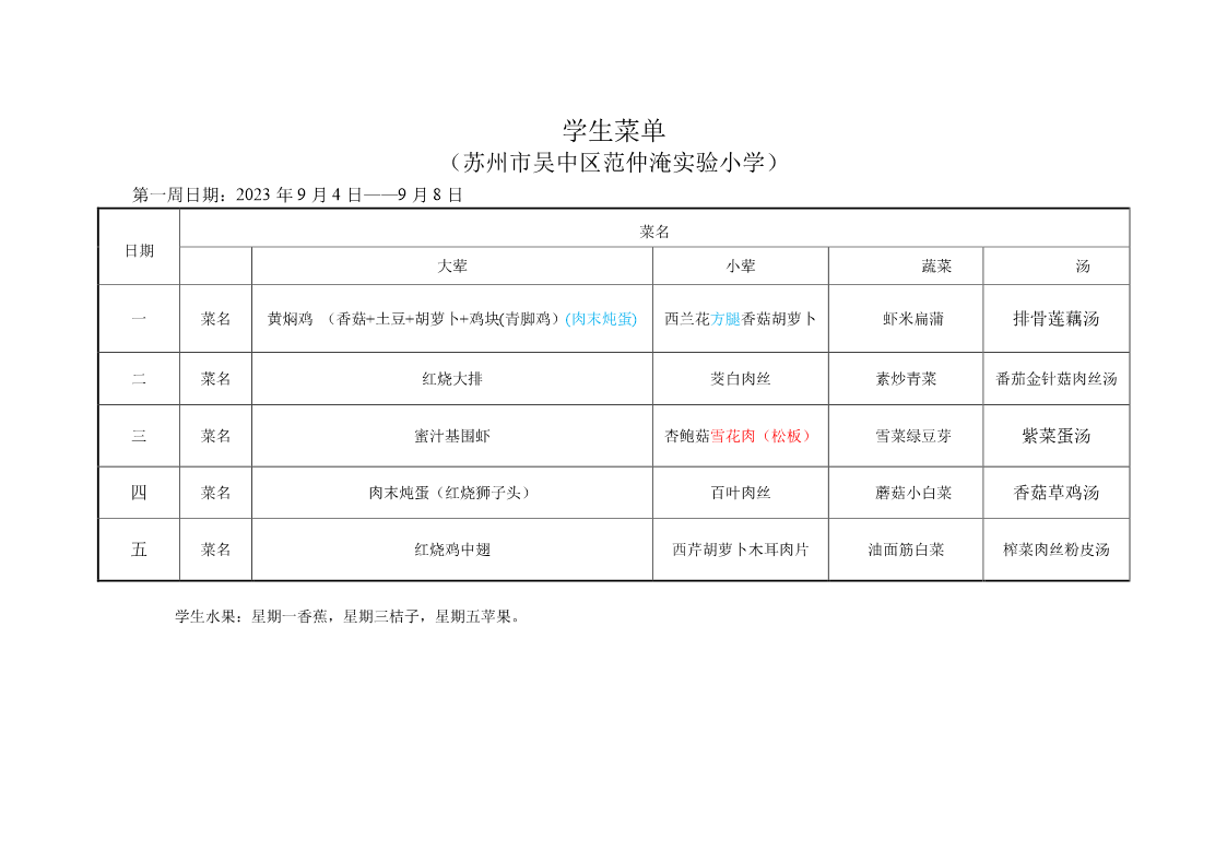 苏州市吴中区范仲淹实验小学2023-2024第一学期第一周学生菜单