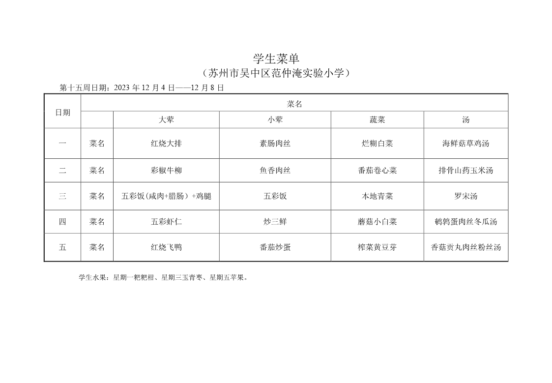 苏州市吴中区范仲淹实验小学2023-2024第一学期第十五周学生菜单