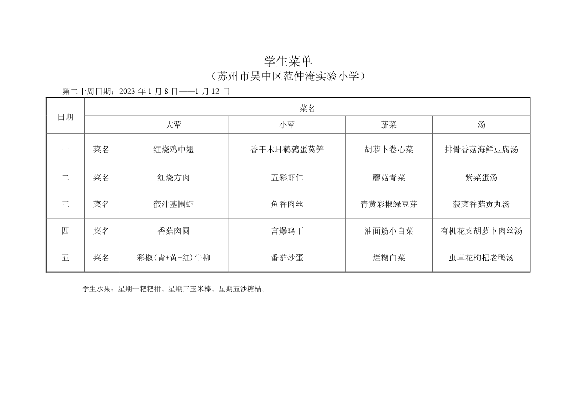 苏州市吴中区范仲淹实验小学2023-2024第一学期第二十周学生菜单