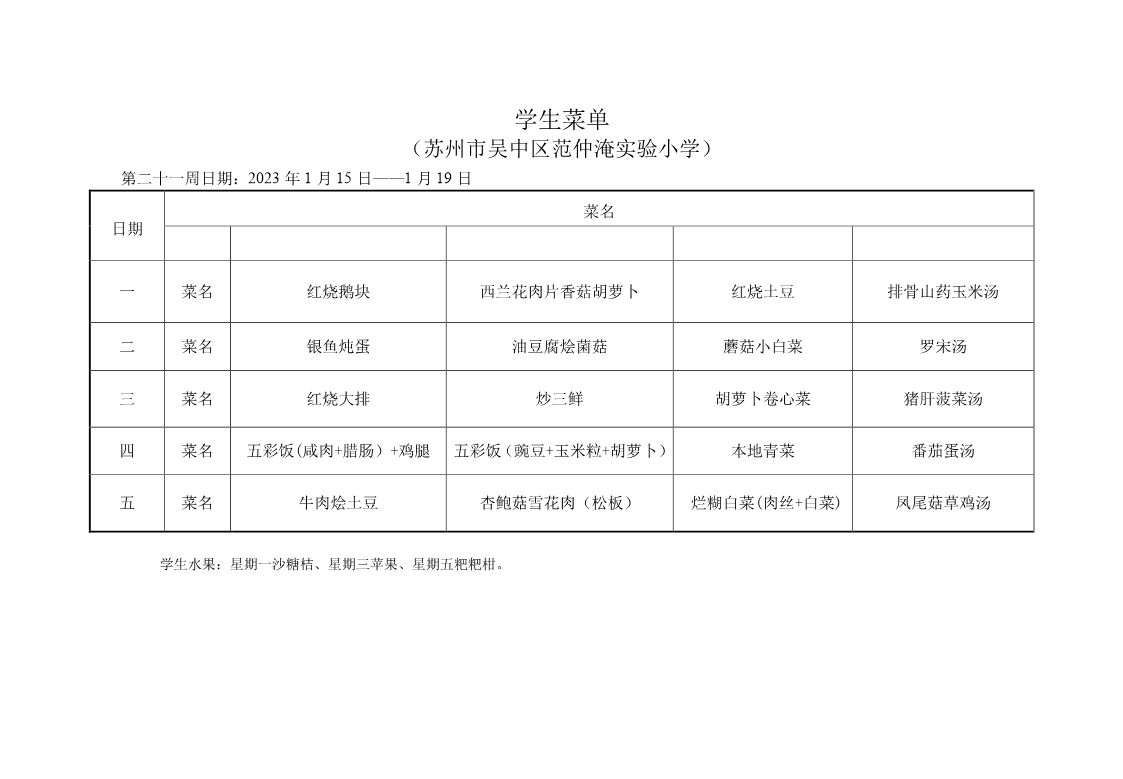 苏州市吴中区范仲淹实验小学2023-2024第一学期第二十一周学生菜单