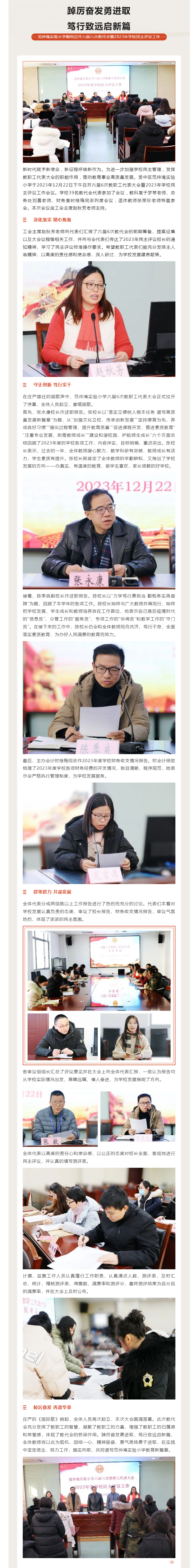 踔厉奋发勇进取 笃行致远启新篇——范仲淹实验小学顺利召开六届六次教代会暨2023年学校民主评议工作 来源: 发布时间:2023-12-28 13:57:58 浏览次数: 次 【字体:小 大】 分享到: 【打印正文】
